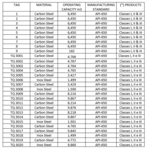 (*) All Tanks are authorized to store Class I, II, and III Products, highlighting: Gasolines, Diesel Fuel, Ethanol Fuel, Biodiesel, Diesel Fuel/Biodiesel Blends, Solvents, Lubricants, etc.