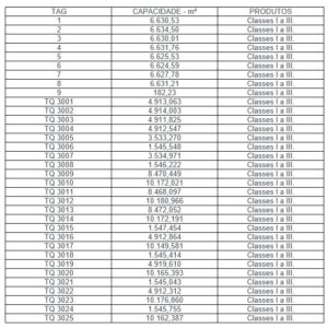 O Terminal possui 09 (nove) Tanques para Armazenagem, totalizando a Capacidade Operacional de 194.692 m³: